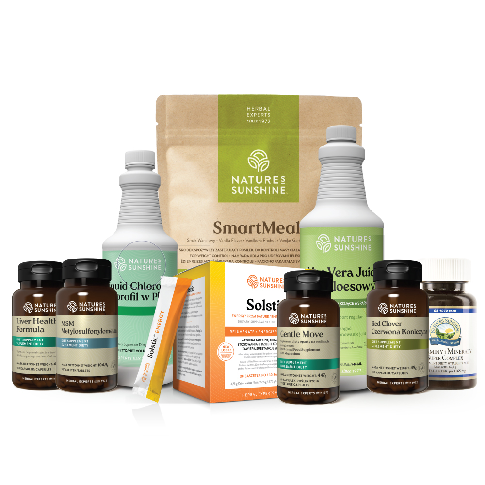 Skład zestawu otwiera nasz absolutny bestseller, a więc Chlorofil w Płynie, bez którego trudno wyobrazić początek podróży do dobrego zdrowia. Znajdziesz tu również wspaniałe źródło białka w postaci pysznego koktajlu SmartMeal, uzupełniający dietę w aż 24 witaminy i minerały Super Complex oraz naturalną energię na każdy dzień płynącą z guarany, yerba maty i witamin z grupy B, które skrywa Solstic Energia z Natury.